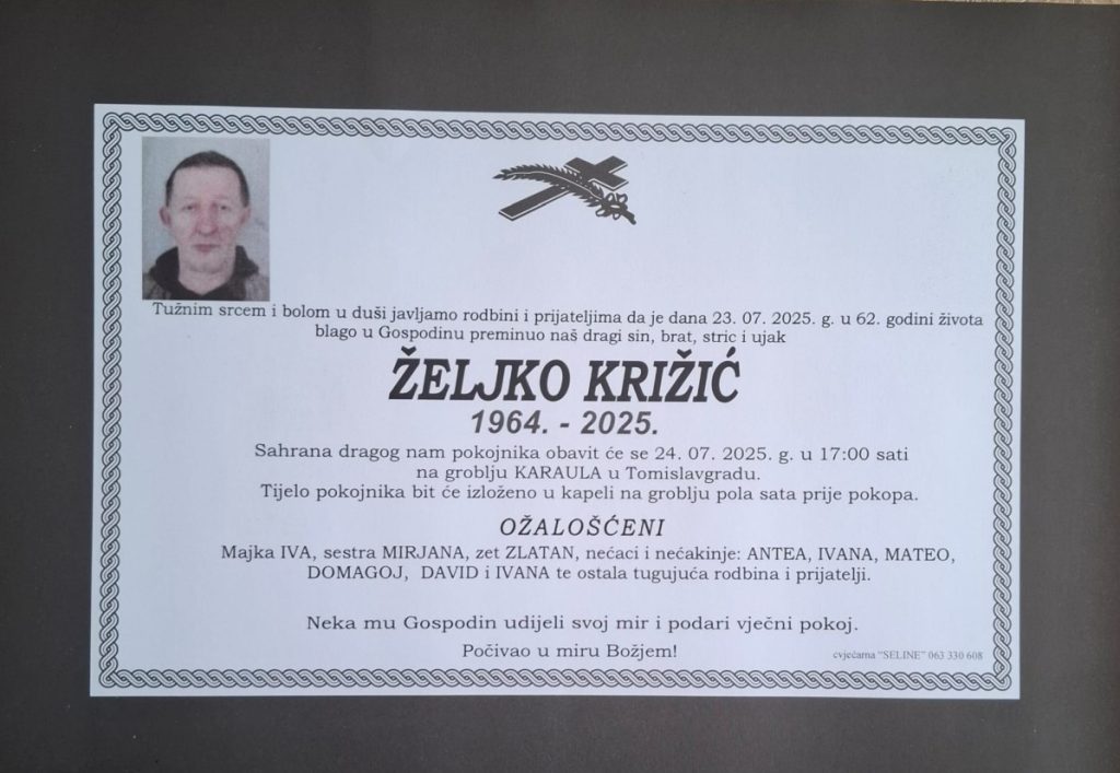 U srijedu, 23. srpnja 2025. godine, u 62. godini života blago u Gospodinu preminuo je Željko Križić.
