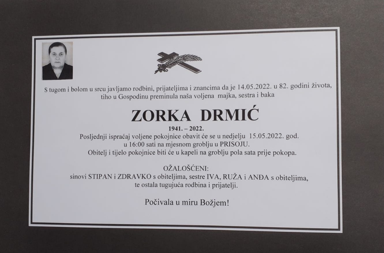 U subotu, 14. svibnja u 82. godini života blago u Gospodinu preminula je Zorka Drmić.