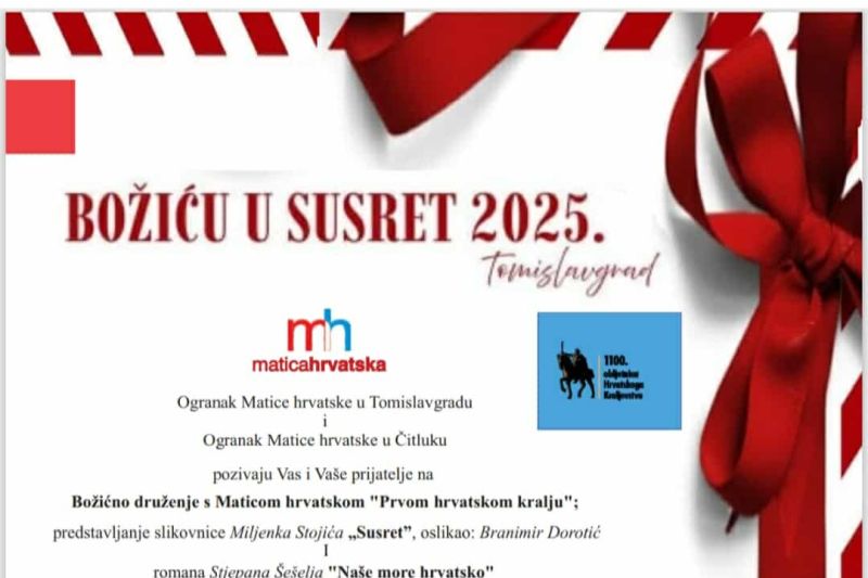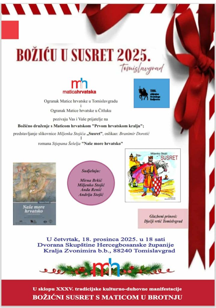 Pozivamo Vas na Božićno druženje s Maticom hrvatskom “Prvom hrvatskom kralju” i predstavljanje romana “Naše more hrvatsko” autora Stjepana Šešelja i slikovnice-bojanke “Susret” autora Miljenka Stojića koju je izdao naš Ogranak u suradnji s Ogrankom Matice hrvatske u Čitluku.