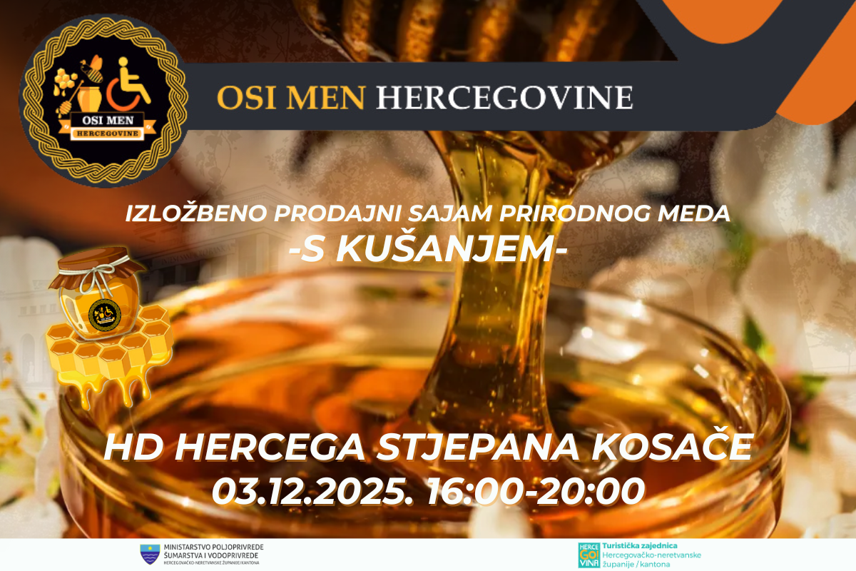 Izložbeno-prodajni sajam prirodnog meda s kušanjem održat će se u srijedu, 3. prosinca 2025. godine, u razdoblju od 16 do 20 sati u Galeriji kraljice Katarine (Hrvatski dom Herceg Stjepan Kosača) u Mostaru. Organizator sajma je Udruga OSI MEN Hercegovine, koja pruža pomoć i potporu osobama stradalim od mina i koja godinama promiče važnost pčelarstva i domaće proizvodnje meda. Na sajmu će se okupiti do 30 izlagača meda i proizvoda od meda.