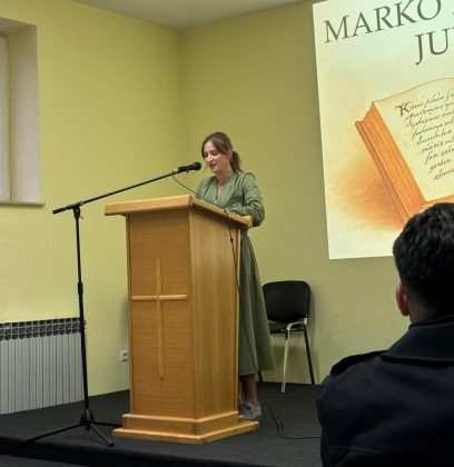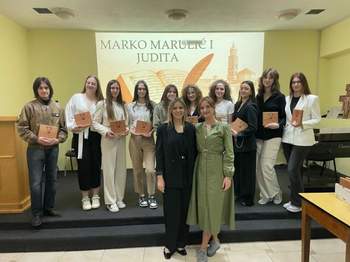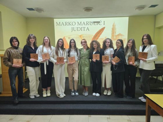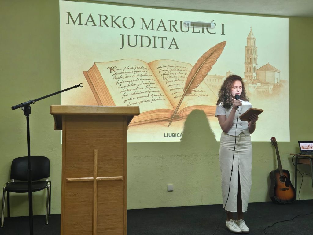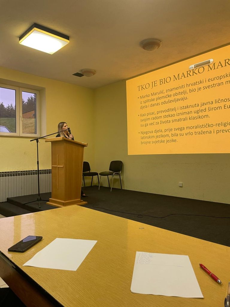 Nakon zanimljivog i poučnog predavanja, duvanjski srednjoškolci iz Gimnazije Marka Marulića i Srednje strukovne škole Tomislavgrad sudjelovali su u malom “Supertalentu” interpretacija ulomaka iz različitih djela Marka Marulića.📖 Publika je o𝐝 𝐧𝐣𝐢𝐡 mogla č𝐮𝐭𝐢 kako je zvučao 𝐡𝐫𝐯𝐚𝐭𝐬𝐤𝐢 𝐣𝐞𝐳𝐢𝐤 𝐮 𝟏𝟔. 𝐬𝐭𝐨𝐥𝐣𝐞ć𝐮, za što su se srednjoškolci marljivo pripremali posljednjih dana te oduševili sve prisutne!