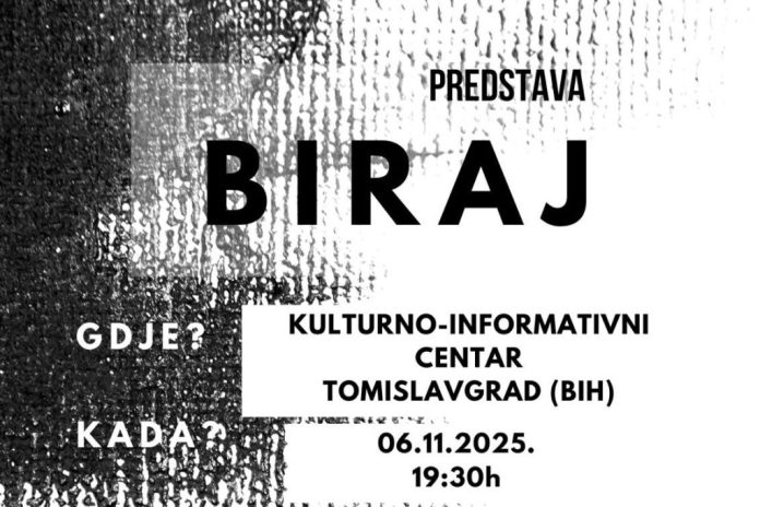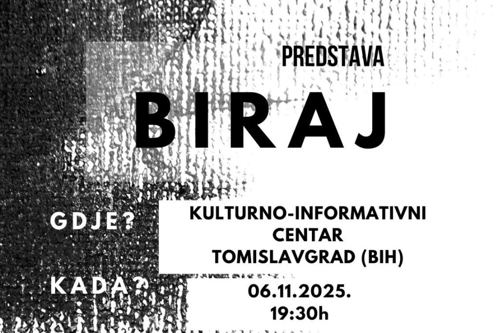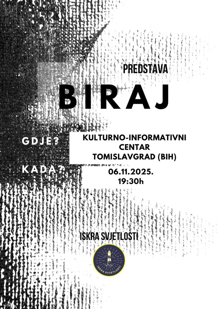 U Kulturno-informativnom centru Tomislavgrad u srijedu, 6. studenoga 2025. godine, s početkom u 19:30 sati, bit će izvedena predstava Biraj u izvedbi članova Udruga Iskra svjetlosti iz Splita.