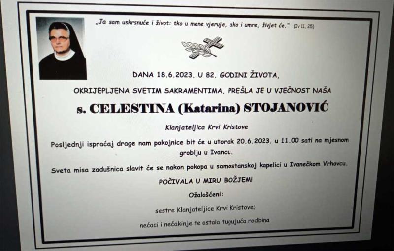 U nedjelju 18. lipnja 2023., u samostanu Marije suotkupiteljice u Ivanovečkom Vrhovcu pokraj Varaždina, opremljena svetim sakramentima, prešla je u vječnost u 82. godini života s. Celestina (Katarina) Stojanović, Klanjateljica Krvi Kistove Regije Zagreb.