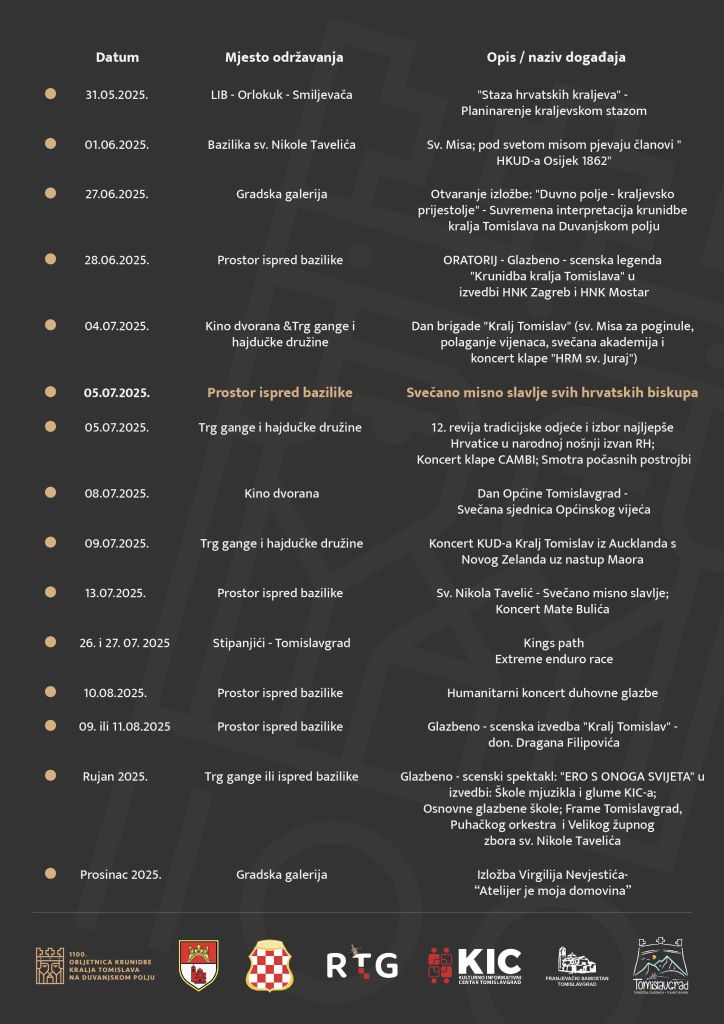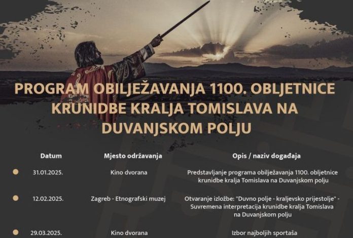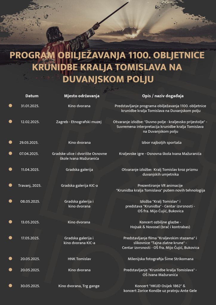 Godine 925. kralj Tomislav okrunjen je na Duvanjskom polju, a točno 1100 godina kasnije, kroz niz događanja, obilježavamo ovu ključnu obljetnicu hrvatske povijesti. Kroz izložbe, koncerte, kazališne predstave, sportska natjecanja i edukativne programe, oživjet ćemo priču o prvom hrvatskom kralju i njegovom vremenu.