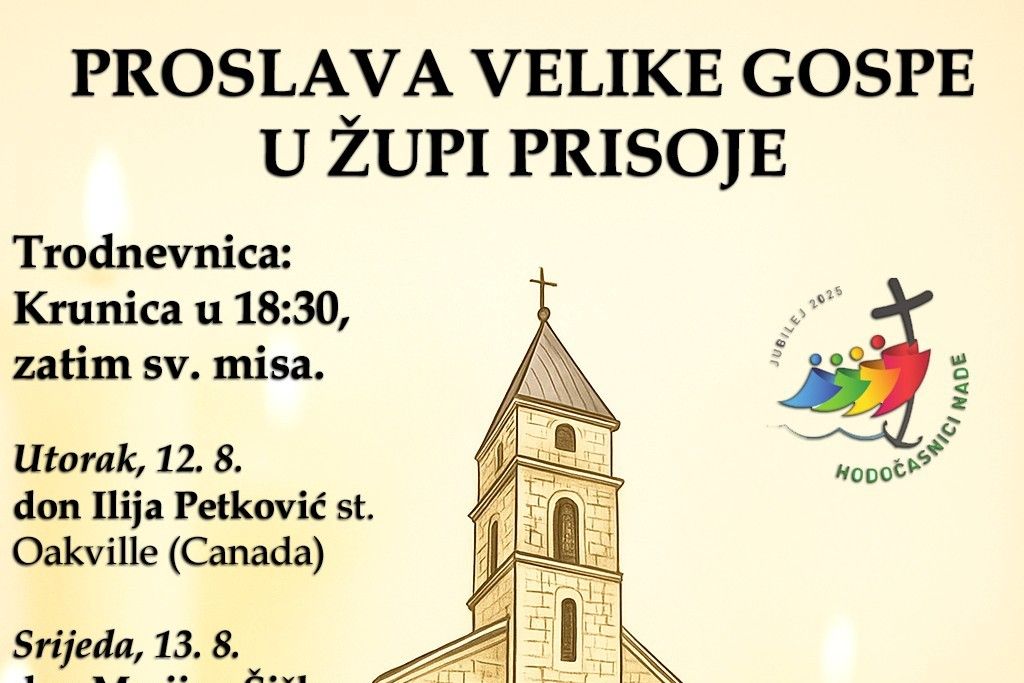 Na svetkovinu Velike Gospe, procesija, litanije i svečana sv. misa bit će u 11:00, koju predvodi don Markus Tymister, sveučilišni profesor iz Rima, priopćeno je iz Župe Uznesenja Blažene Djevice Marije, Prisoje.