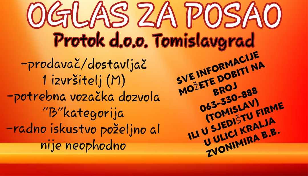 Protok d.o.o. Tomislavgrad zapošljava jednoga prodavača/dostavljača.