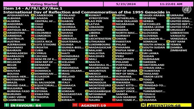 S druge strane kod Bošnjaka vladala je napetost. Pitanje je bilo hoće li biti dovoljno ruku za usvajanje Rezolucije. I rezultat glasovanja pokazuje da je zabrinutost bila opravdana. Manje od polovine članica Generalne skupštine glasalo je za Rezoluciju. To je veliki problem. Kada se radi o genocidu ili ratnom zločinu onda bi za ovakve rezolucije moralo biti puno više država. Sa 84 glasa Rezolucija je usvojena ali ostaje gorak okus kako je to ipak manji broj od onoga što se očekivalo i što bi po prirodi događaja trebalo biti. Šezdeset i devet država je ostalo suzdržano. Zanimljivo i veliki broj islamskih država. Nije mi jasno zašto su ostale suzdržane. Devetnaest država je glasalo protiv Rezolucije. I za neke je potpuno jasno zašto. Rusija, Kina, Sjeverna Koreja, Kuba itd. iz svojih odnosa sa Srbijom. Možda je bolje reći iz kontre SAD-u i EU-u. Neke su bile protiv jer se i na njihovom području događa ili se u nedavnoj prošlosti dogodio genocid pa onda i strah od iste osude. Uglavnom “pobjeda” nije onakva kakva se očekivala a niti poraz ne znači baš nešto novo.