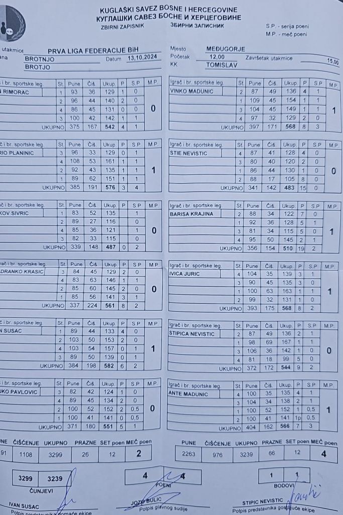 U utakmici 1. kola kuglačkog prvenstva 1. lige Federacije BiH, igrači KK Tomislava gostovali su u Međugorju gdje su odigrali utakmicu s ekipom KK Brotnjo. Utakmica je završila neriješenim rezultatom 4:4. Za Tomislav su nastupili: Vinko Madunić, Stipe Nevistić, Bariša Krajina, Ivica Jurić, Stipica Nevistić i Ante Madunić.