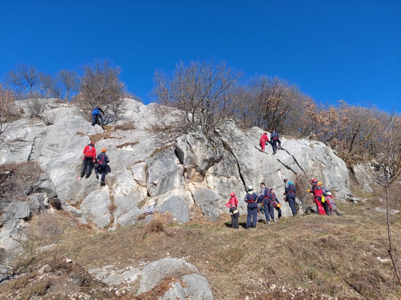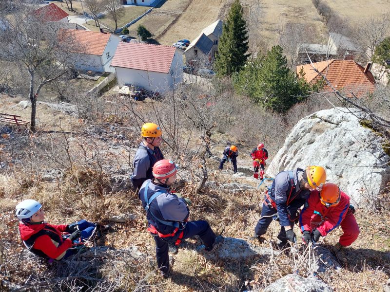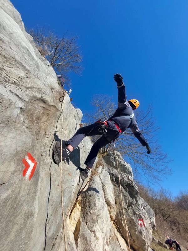 Hladni, ali sunačani jutarnji dan nije mogao pokvariti želju školaraca da prvi put u životu osjete kako izgleda speleološko “penjanje i spuštanje”. Već tradicionalno, školarci su svoje prve korake učili na stijeni u Mandinu selu. Sa oblačenjem opreme upoznao ih je Marino Vidović. Nakon toga je slijedilo spuštanje niz stijenu koje je većini jako dobro pošlo za rukom. Nakon spuštanja slijedilo je penjanje, te prelazak sidrišta. Svi kandidati su više puta prošli kružni poligon penjanja, prelaska sidrišta i spuštanja.