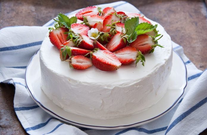 5. Ako ste radili jednu veliku koru, prerežite je po dužini na tri jednaka dijela i složite kolač: na prvu koru nanesite dio kreme od vanilije, po kremi složite narezano voće pa premažite tučenim slatkim vrhnjem. Ponovite isto i s ostale dvije kore pa cijeli kolač premažite preostalim tučenim vrhnjem i ukrasite po vlastitom ukusu. Ako ste radili više okruglih kora, slažite ih jednu na drugu i filajte na isti način pa naposljetku premažite tučenim slatkim vrhnjem i ukrasite voćem.