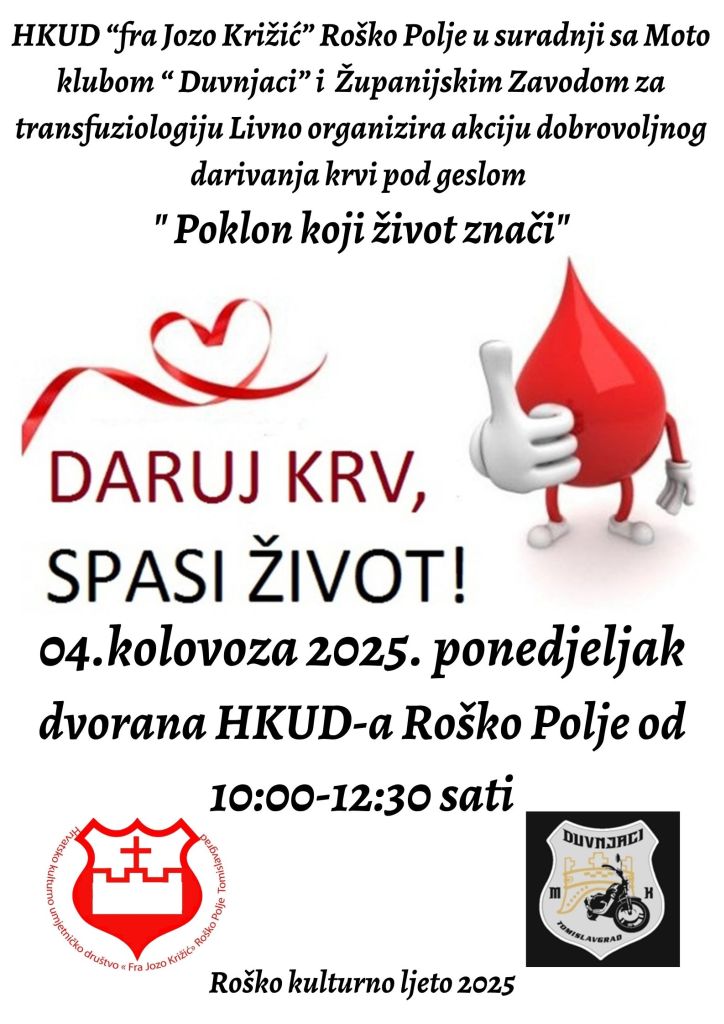 HKUD “fra Jozo Križić” Roško Polje u suradnji s Moto klubom “Duvnjaci” i Županijskim Zavodom za transfuziologiju Livno organizira akciju dobrovoljnog darivanja krvi pod geslom “Poklon koji život znači”.