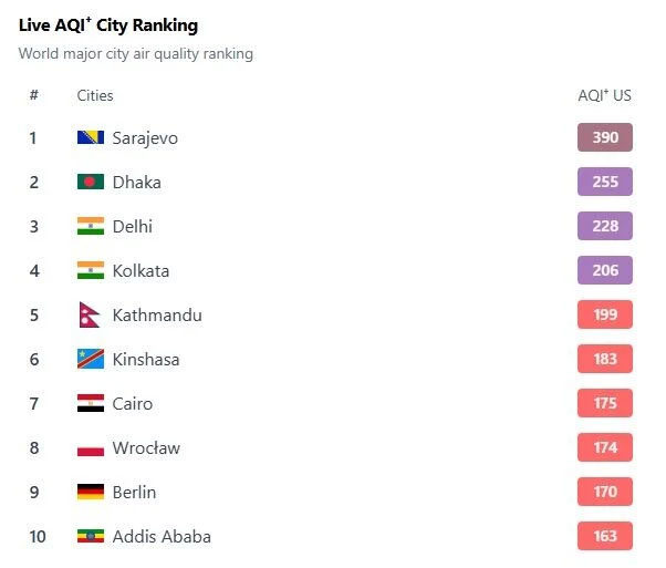 Sarajevo se i jutros ponovno našlo na vrhu svjetske ljestvice gradova s najzagađenijim zrakom. Prema dostupnim mjerenjima, koncentracija štetnih čestica PM2.5 u 8 sati iznosila je čak 50,9 puta više od godišnje granične vrijednosti koju preporučuje Svjetska zdravstvena organizacija (WHO).