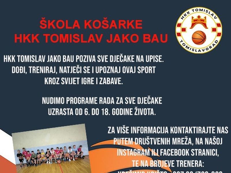 Škola košarke HKK Tomislav Jako Bau poziva na upise sve dječake uzrasta od 6. do 18. godine.