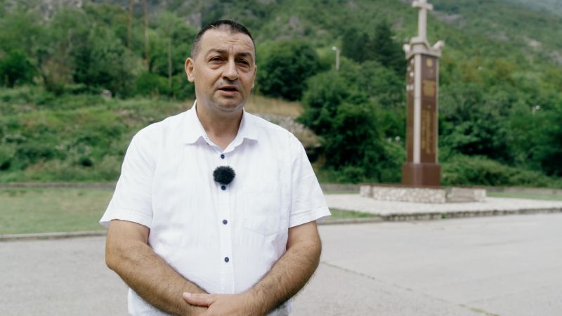 S Drežnjakom novinari Balkanske istraživačke mreže Bosne i Hercegovine (BIRN BiH) razgovaraju ispred spomen-obilježja na kojem je ime Mladenka Zadre, najmlađe četverogodišnje žrtve. Najstarija žrtva zločina u Grabovici je bio Marko Marić, koji je imao 87 godina.