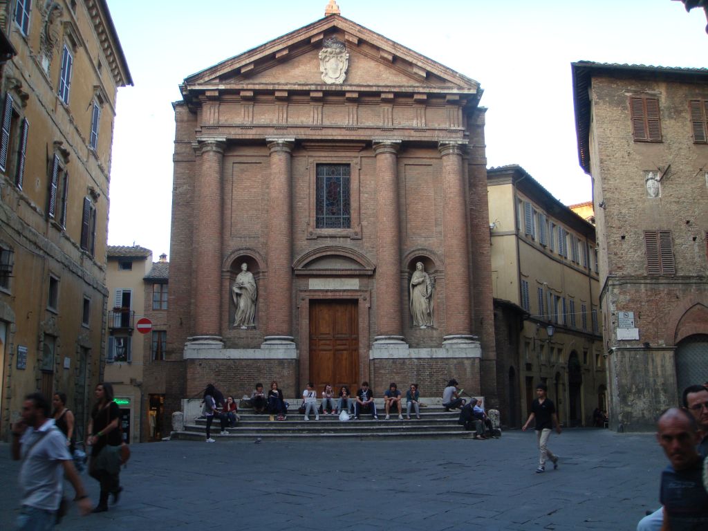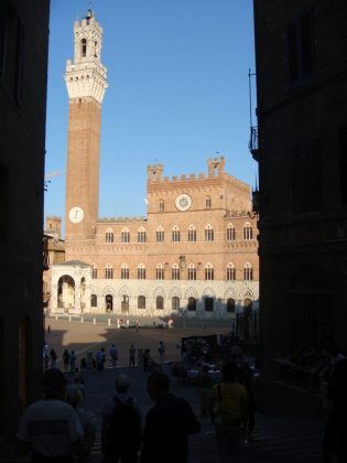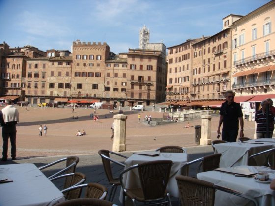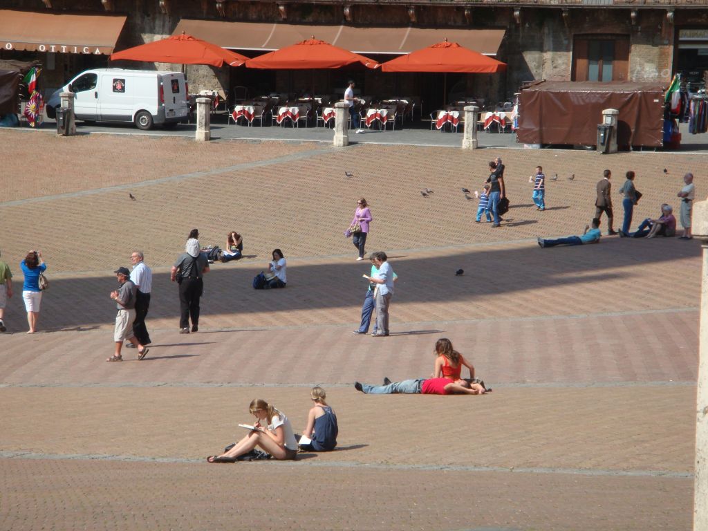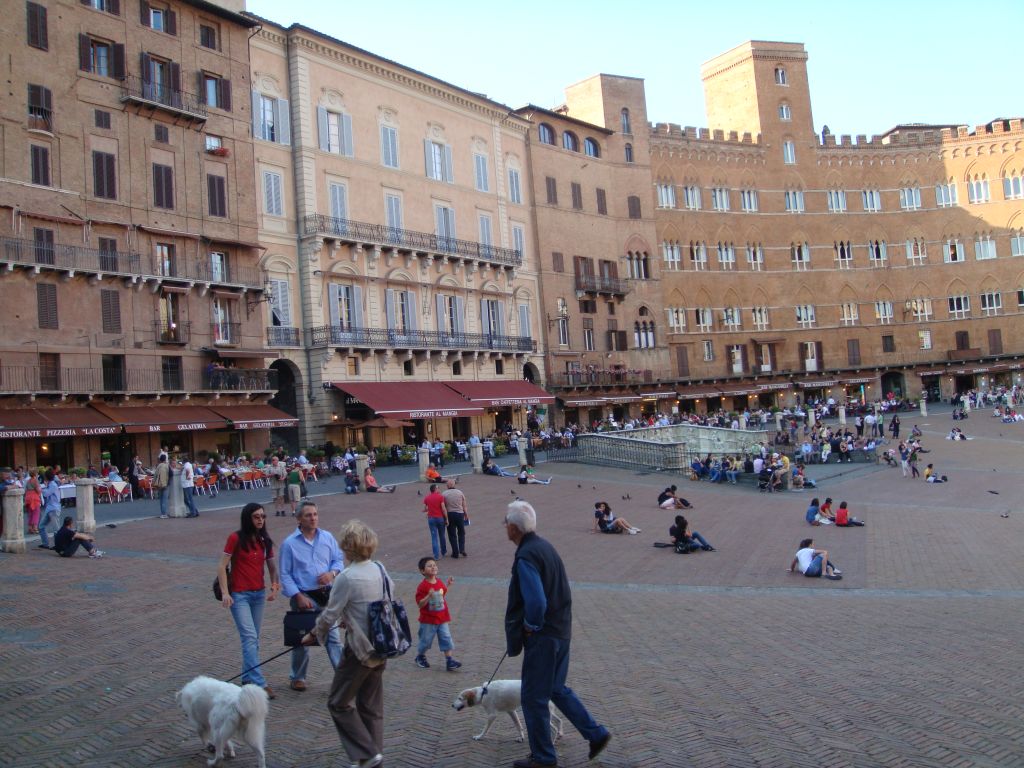 Ogromni trg načičkan je bezbrojnim terasama restorana i kafića, a ispred njih se nalaze mnogobrojni štandovi prodavača turističkih suvenira. Na sredini trga pak mladi ljudi sjede ili leže na pločniku kao na livadi. Gore visoko, oko tornja, lastavice munjevitom brzinom kruže uz veselo cijukanje. Provest ću tu najviše vremena jer je atmosfera jedinstvena, a jelo i vino više nego ukusni. Doduše, cijene su puno više nego u dosadašnjim talijanskim gradovima, no što kaže Luksemburžanin: „Što ne košta ništa, i ne vrijedi ništa!“