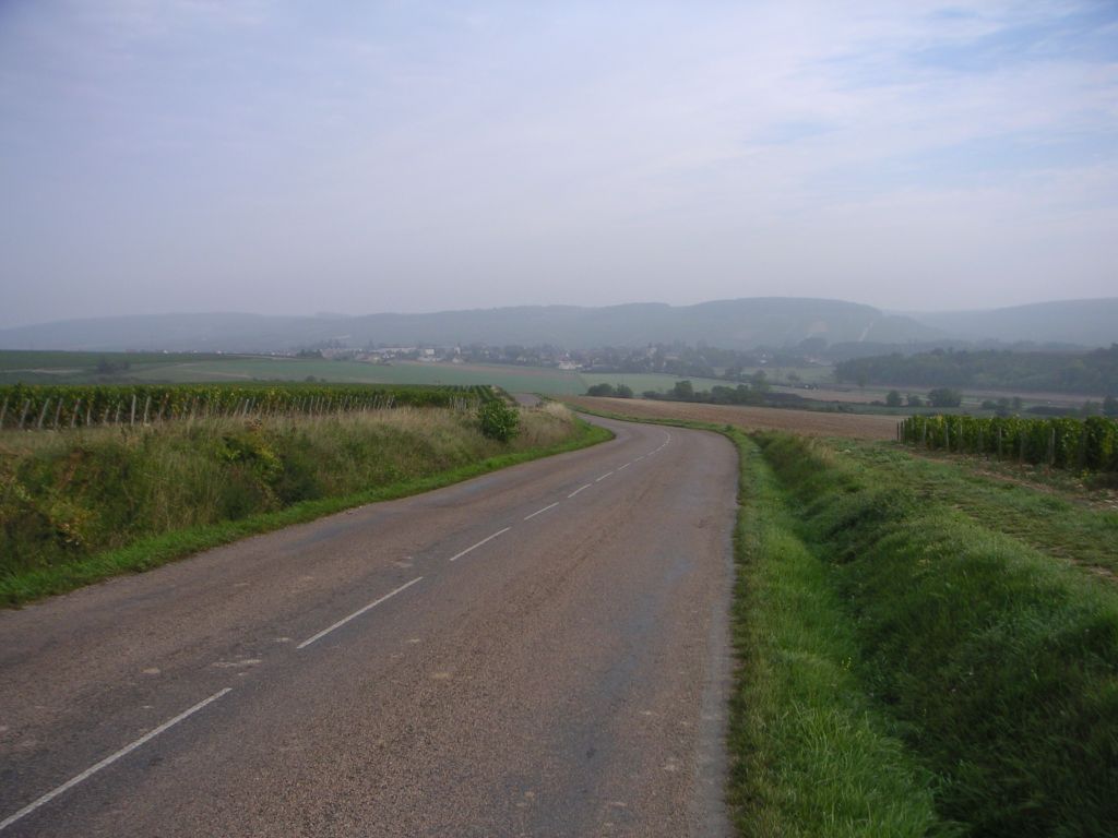Put vodi uzbrdo cestom. Magla se još nije potpuno digla i Chablis, koji sam napustio prije pola sata, tek se nazire dolje u dolini.