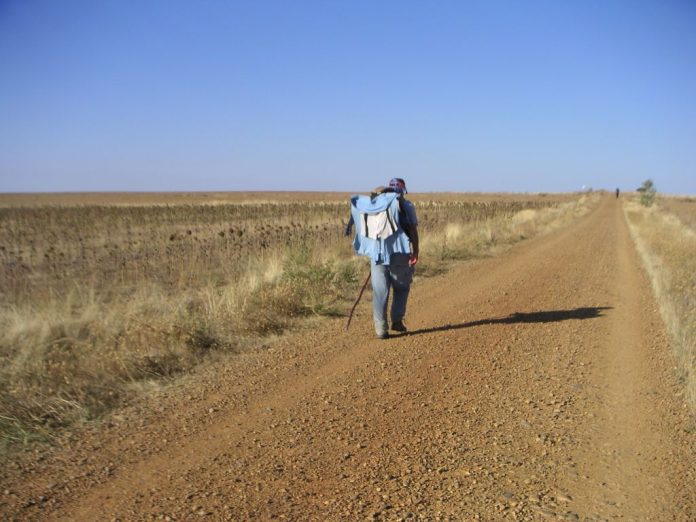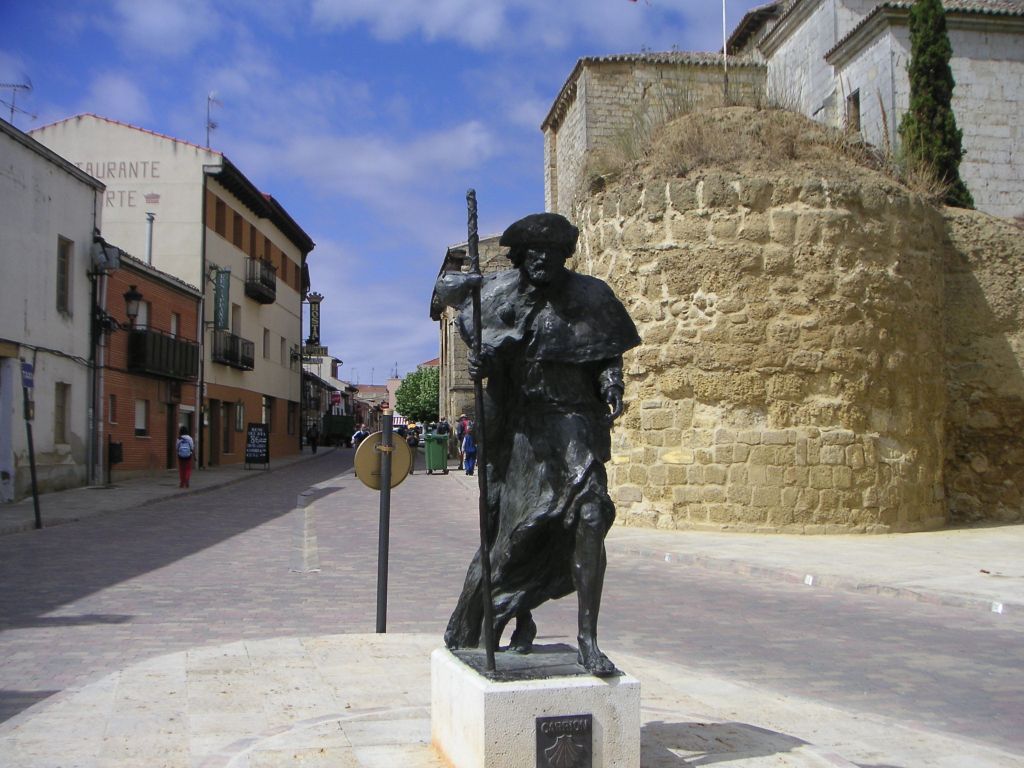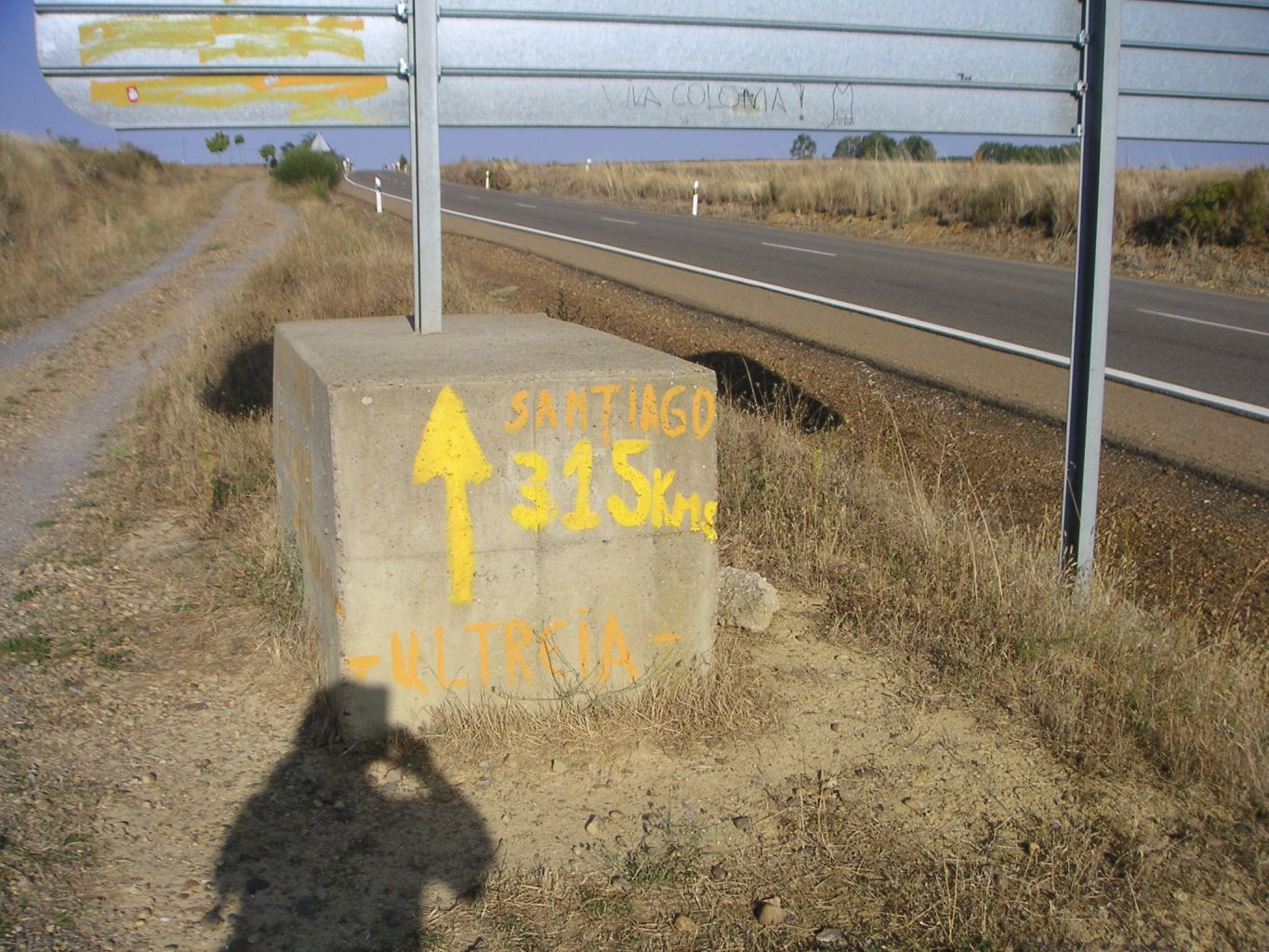 Put ide pored ceste, ali promet je slab pa nema previše buke. S lijeve strane puta posađene su topole pa daju malo hlada. Na velikome betonskom bloku žutom bojom napisano „Santiago 315 km“. Ipak se približavam. Nešto dalje križ u spomen nekoga hodočasnika, Nijemcu koji je ovdje izgubio život 1998. godine. A nekoliko stotina metara dalje još jedan. Znam da tu negdje postoji groblje gdje su pokopani hodočasnici koji zbog raznih razloga nisu mogli biti preneseni u svoje zemlje. Ima ih na stotine i stotine. A ukupan broj onih koji su umrli na ovom putu vjerojatno nitko i ne zna. Ili neće publicirati.