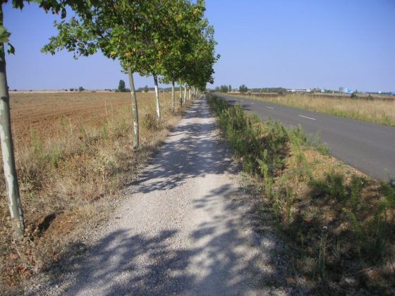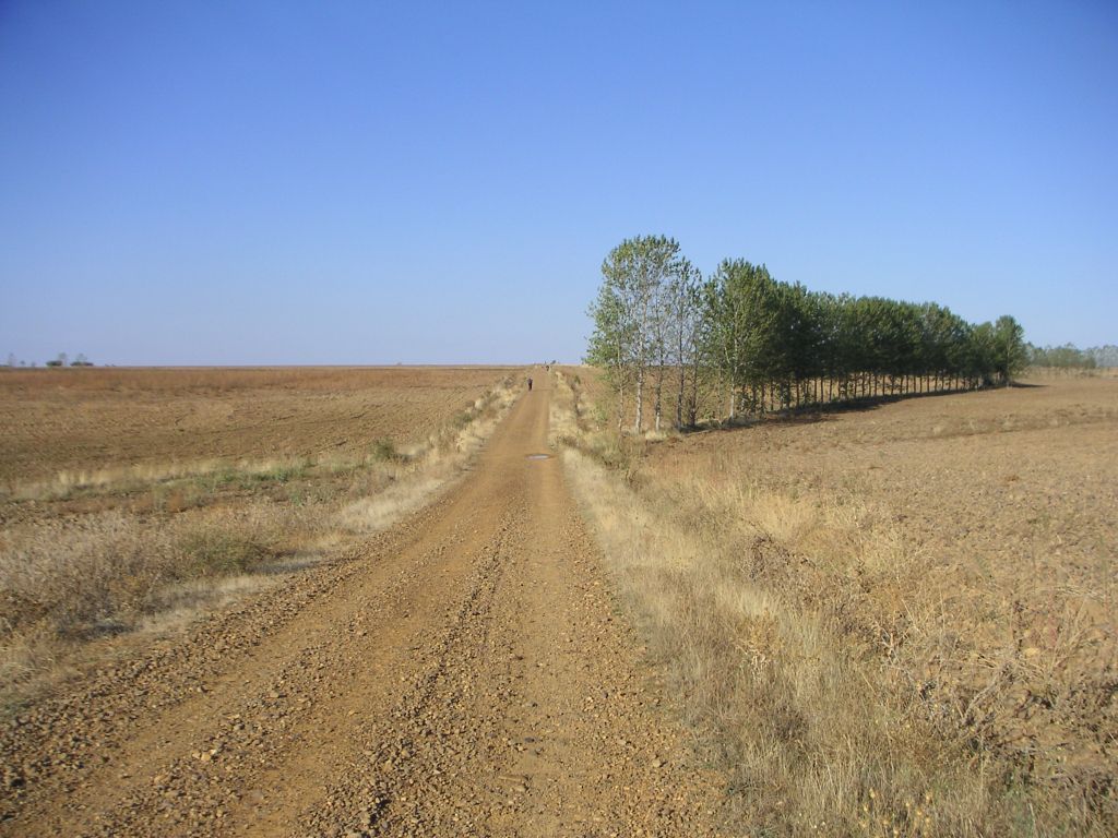 Put, prekriven kamenjem ide u ravnoj crti, između dvaju redova mladih topola i kraj mu se gubi tamo daleko gdje kao da se nebo spustilo na zemlju. Topole su posađene da bi hodočasnicima pružile bar malo hlada. Iako sam krenuo rano, ne vidim puno hodočasnika ispred sebe. Tek pojedince od kojih je jedan objesio svoj „veš“ na torbu da se suši. Koliko puta sam i ja to isto morao činiti. Danas pak to nije problem jer se večeras vraćam u isti hotel pa sam stvari koje nisu bile suhe ostavio do večeras. Nadam se da neće biti problema s taksijem jer je Brigitte obećala nazvati ga i reći mu da dođe po mene u 16 sati u Moratinho. Do sada je sve funkcioniralo fantastično pa nemam razloga sumnjati da će i dalje tako biti.