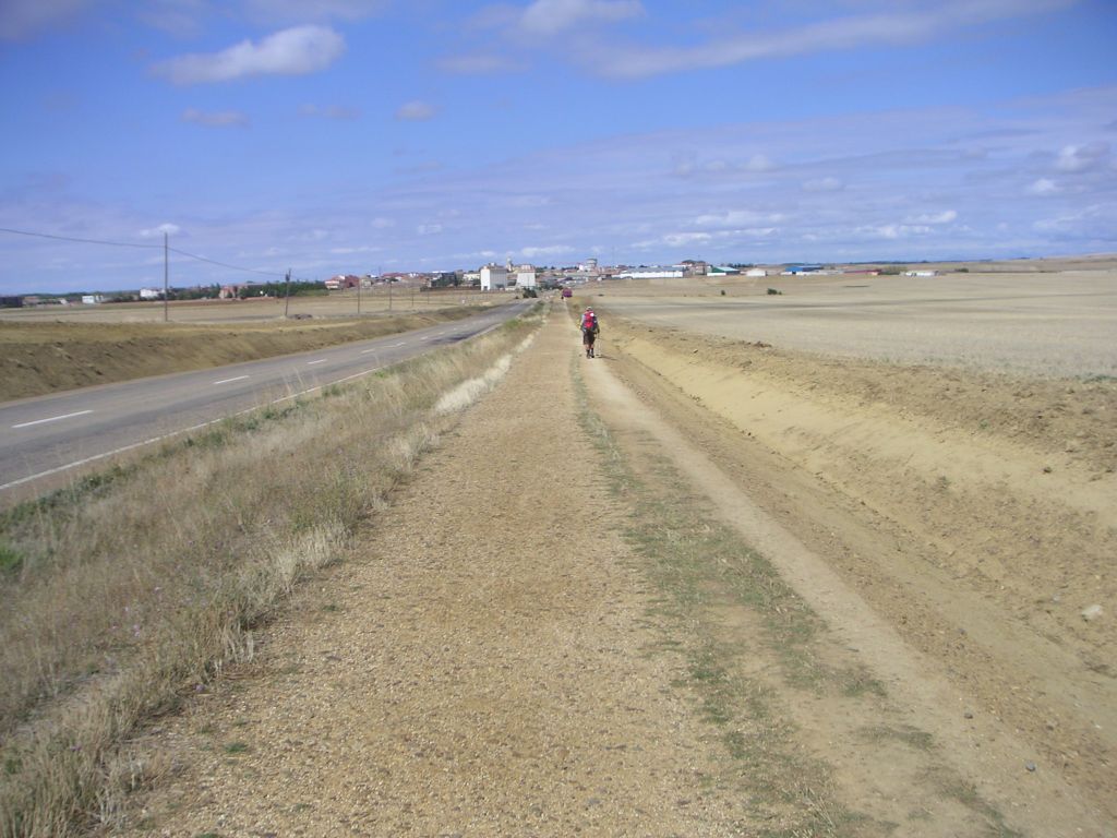 Obilazim hodočasnike jednog po jednog jer još idem brzo. A onda mene obiđe jedan mladić, koji ide tako brzo da imam osjećaj da stojim. Kao kad te Porsche obiđe na autoputu. Sunce se već popelo visoko i osjećam kako me prži kroz šešir. Sad mi nije žao što imam kratke hlače. Vodič me upozorio da na ovom djelu puta nema puno mogućnosti napuniti bocu vodom pa sam ponio dvije. I zaista nakon onih topola u početku sad više nema drveća. Ustvari, osim pokošenih izgorjelih polja sa strane i puta ispred nema ništa. Horizont je beskrajan. Samo praznina između crvenkaste zemlje i plavog neba, na kojem nema niti jednog oblačka da barem na trenutak prekine ovu neizmjernost. Nema više hodočasnika pa sam sâm na ovoj pučini. Jedini zvuk koji čujem je zvuk mojih koraka na kamenju koje se ponekad kotrlja. Kakva ljepota! Za nekoga tko voli tišinu i daleke horizonte, ova neizmjernost, ispunjena samo sunčanim zracima dar je s neba.