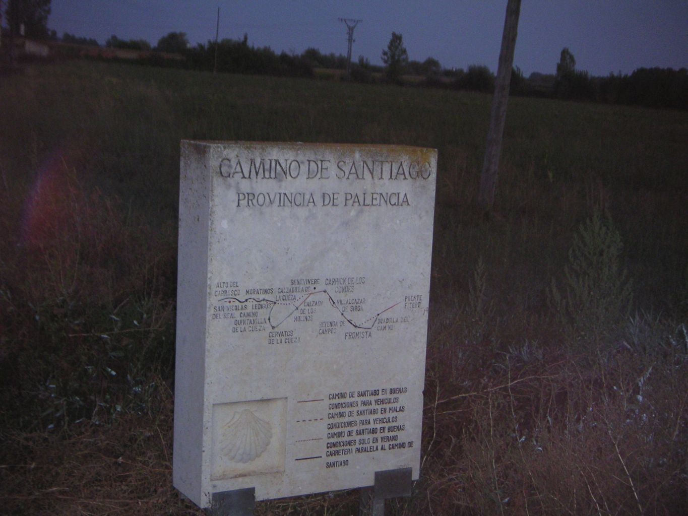 U 7,30, kad sam krenuo, još je mrak pa moram pitati prolaznike gdje se nalaze znakovi jer ih u mraku ne mogu razaznati. Na izlazu iz grada tabla na kojoj piše da je Santiago udaljen 455 km. Jutros je hladno (7 stupnjeva) a ja u kratkim hlačama i košulji kratkih rukava pa žurim ne bih li se ugrijao. Prvi sat sam prešao više od 5 kilometara i ugrijao se. A onda je sunce izašlo pa me i ono s leđa, malo s lijeve strane grije. Da, na ovom putu ka zapadu sunce se ujutro nalazi iza mene, a onda prolazi s lijeve strane tako da sam puno više pocrnio s te strane nego s desne. Možeš čak po tome pogoditi tko je hodočasnik.