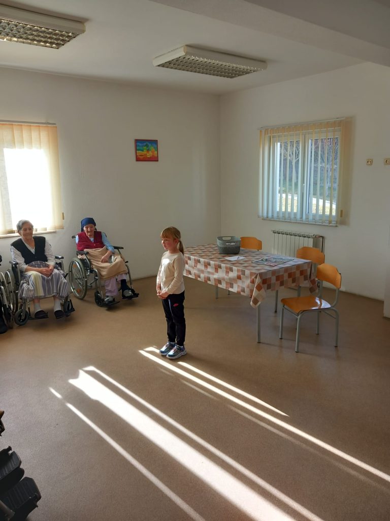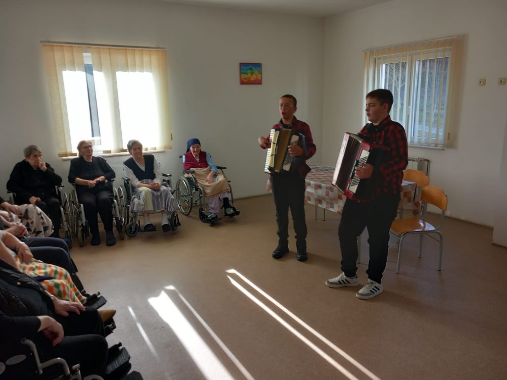 Druženje se nastavljeno uz zvonku pjesmu: naše harmonikaše, gangašice i gangaše te malene guslare koji u ove prostorije unesoše snažnu radost i veselje. Među štićenicama brzo smo prepoznali poznata nam lica koja smo izgrlili, a među njima Vlatku Bagarić i Katu Marinčić koje su nedavno bile gošće u našem Centru izvrsnosti gdje su naše male znatiželjnike učile vještini pletenja. One su nama darovale pletene suvenire, a naši djelatnici i roditelji za njih su pripremili domaće kolače, one meke, žute koje najviše vole! Rastali smo se uz obećanje da se uskoro opet vidimo, a povod druženju lako ćemo naći, ionako za toliko emotivne i lijepe susrete poseban povod nije ni potreban.