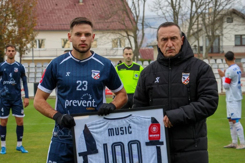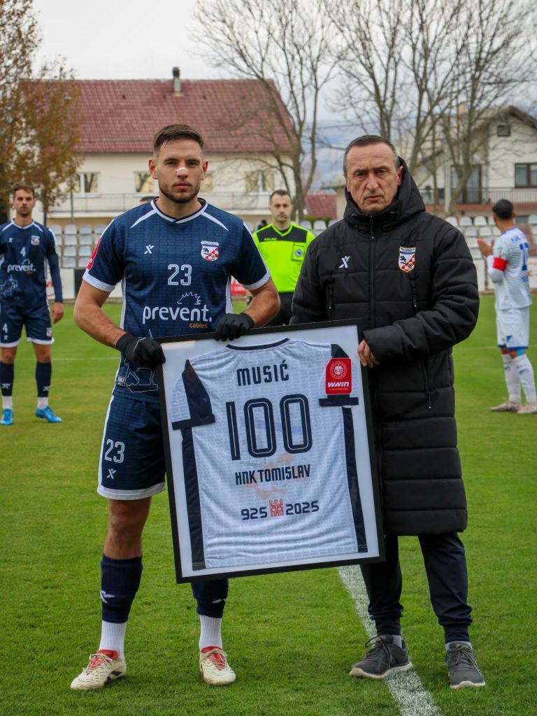 Prije početka jučerašnjeg susreta između HNK Tomislav i NK TOŠK, predsjednik kluba Ilija Bagarić uručio je Stipanu Musiću posebno priznanje povodom značajnog jubileja – 100. odigrane utakmice u plavo-bijelom dresu.