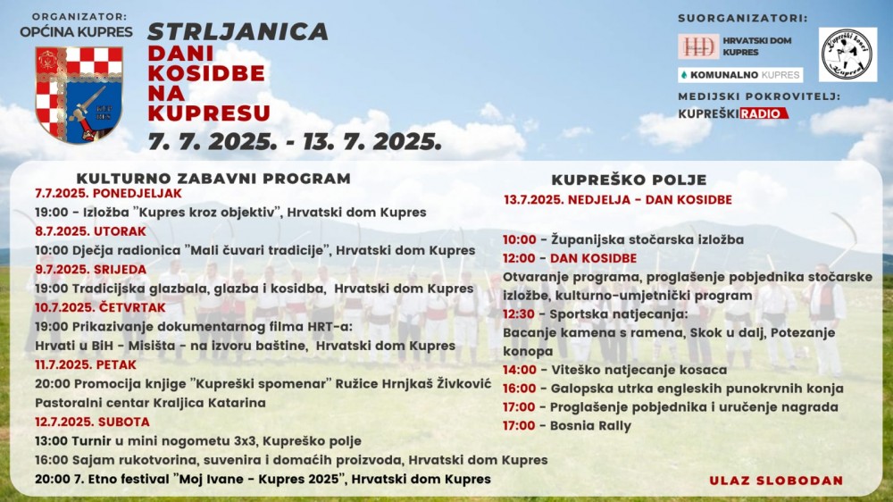 Ulaz je slobodan, a organizatori – Općina Kupres, Hrvatski dom Kupres, Komunalno Kupres i Kupreški kosci – pozivaju sve da dođu i zajedno proslave duh tradicije, zajedništva i natjecanja, navodi Kupreški radio.