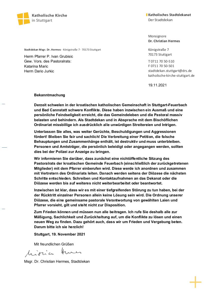 U svom dopisu, koji je na župnoj Facebook stranici objavljen na njemačkom jeziku, uz prijevod na hrvatskom jeziku koji u potpunosti ne odgovara precizno svemu onome što je napisao, dekan msgr Hermes navodi kako „u dogovoru s Biskupskim ordinarijatom, izričito osuđuje sve nedostojne svađe i spletke“.
