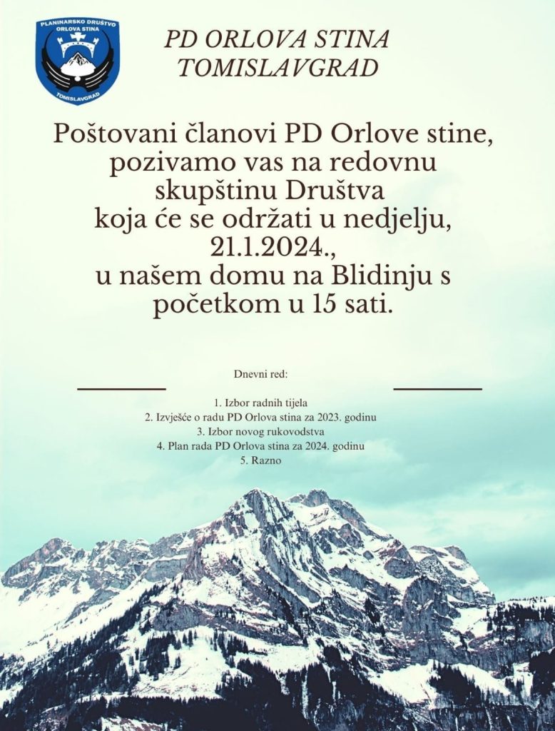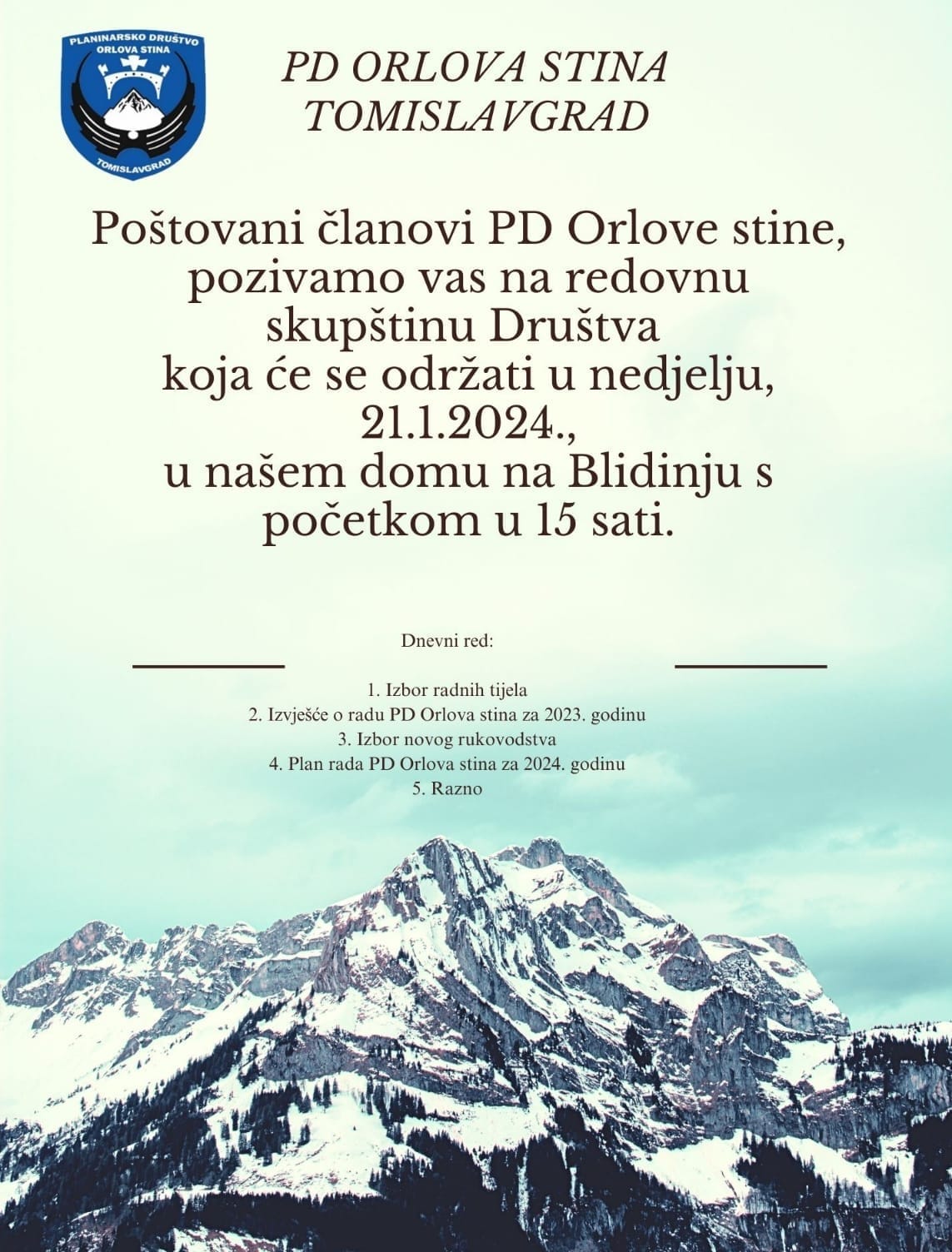 Planinarsko društvo Orlova stina najavilo je svoju redovnu izvještajnu i izbornu skupštinu koja će se održati sutra, 21. siječnja u planinarskom domu na Blidinju s početkom u 15 sati.