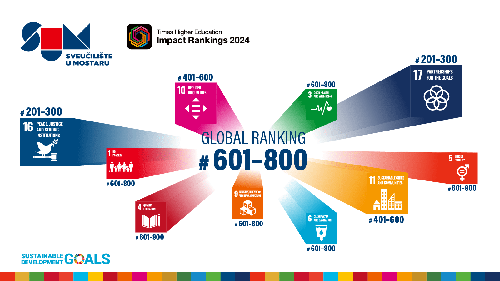 Sveučilište u Mostaru (SUM) na najnovijoj Times Higher Education svjetskoj rang-ljestvici u najvažnijemu 17. cilju pozicionirano je od 201. do 300. mjesta od 2031 institucije te je time ostvarilo najznačajniji uspjeh Sveučilišta u Mostaru od svoga postojanja i nalazi se u društvu u društvu tri posto najboljih sveučilišta svijeta.