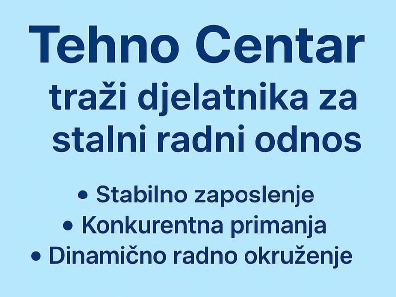 📍 Tehno Centar Tomislavgrad traži djelatnik u stalni radni odnos