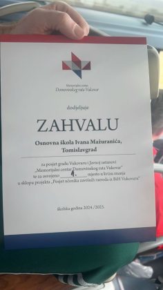 Kao što smo već ovih dana javljali, učenici Osnovne škole Ivana Mažuranića Tomislavgrad posjetili su grad Vukovar u sklopu projekta “Posjet učenika završnih razreda iz BiH Vukovaru”. Tijekom ovog terenskog izleta, koji je uključivao obilazak značajnih lokacija poput Spomen doma hrvatskih branitelja, Spomenika masovne grobnice Ovčara, te Memorijalnog groblja Vukovar i Vukovarske bolnice, učenici su imali priliku učiti o Domovinskom ratu i hrabrosti ljudi koji su se borili za slobodnu Hrvatsku.