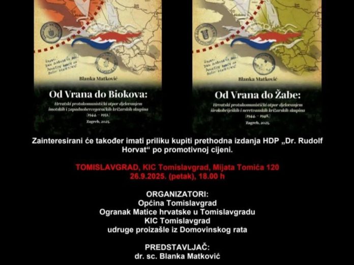Hrvatska družba povjesničara „Dr. Rudolf Horvat“ poziva vas na predstavljanja dvije nove knjige koje pod naslovom “Od Vrana do Biokova: Hrvatski protukomunistički otpor djelovanjem imotskih i zapadnohercegovačkih križarskih skupina (1944.-1951.)” i “Od Vrana do Žabe: Hrvatski protukomunistički otpor djelovanjem širokobrijeških i neretvanskih križarskih skupina (1944.-1948.)” potpisuje dr. sc. Blanka Matković.