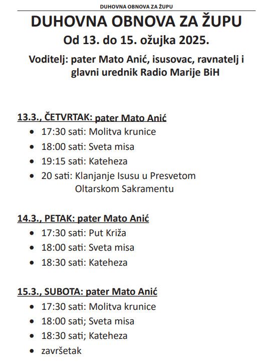 Večeras počinje korizmena duhovna obnova u našoj župi, i traje do subote. Duhovnu obnovu predvodit će pater Mato Anić, isusovac, ravnatelj i glavni urednik Radio Marije BiH. Molitveni program svaki dan počinje u 17:30, molitvom krunice, odnosno pobožnošću puta križa, slijedi sveta misa s propovijedi i nagovorom, a u četvrtak će biti klanjanje Isusu u Presvetom Oltarskom Sakramentu.