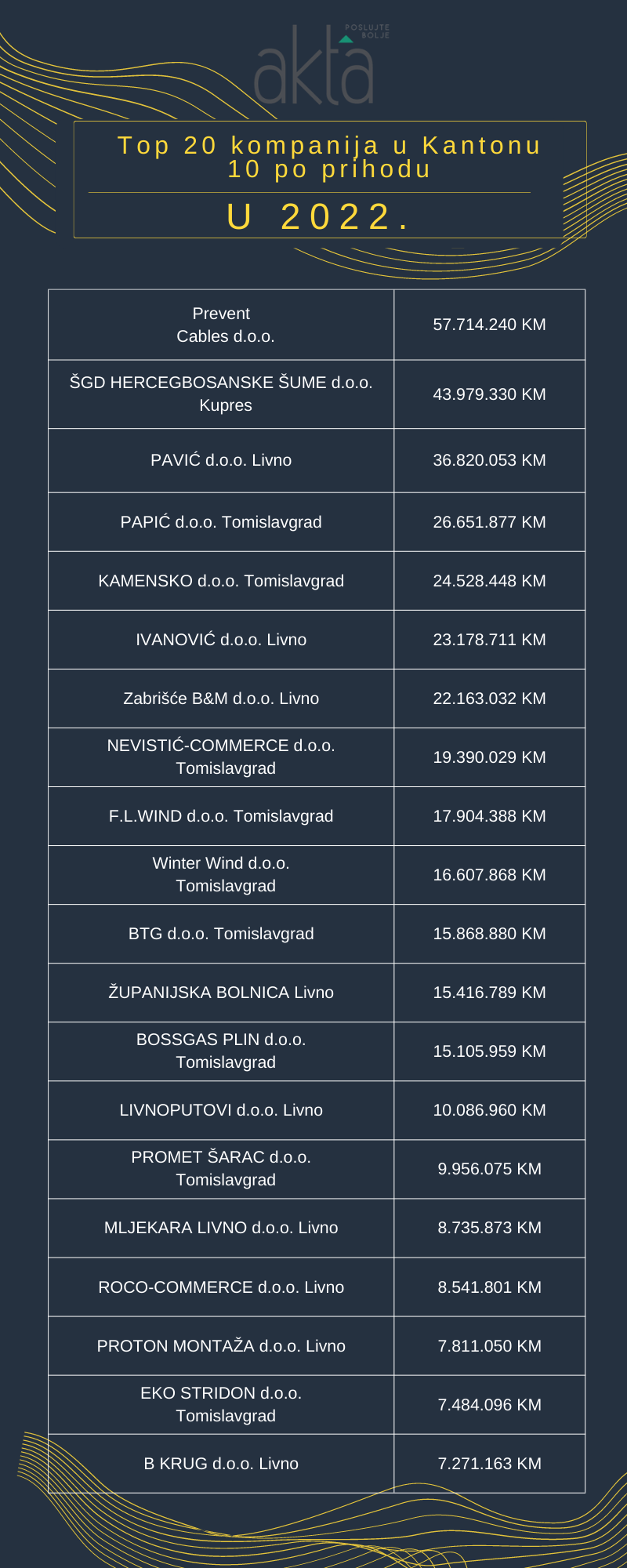 Najveći prihod imao je Prevent Cables d.o.o. (Tvornica kabela Tomislavgrad) iz Tomislavgrada s prihodom od 57.714.240 KM. Druge su ŠGD HERCEGBOSANSKE ŠUME d.o.o. Kupres s prihodom 43.979.330 KM. Treći po prihodu je PAVIĆ d.o.o. iz Livna. Njihov prihod je bio 36.820.053 KM.