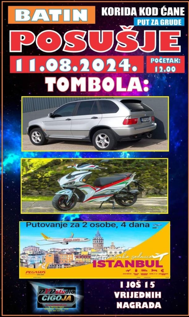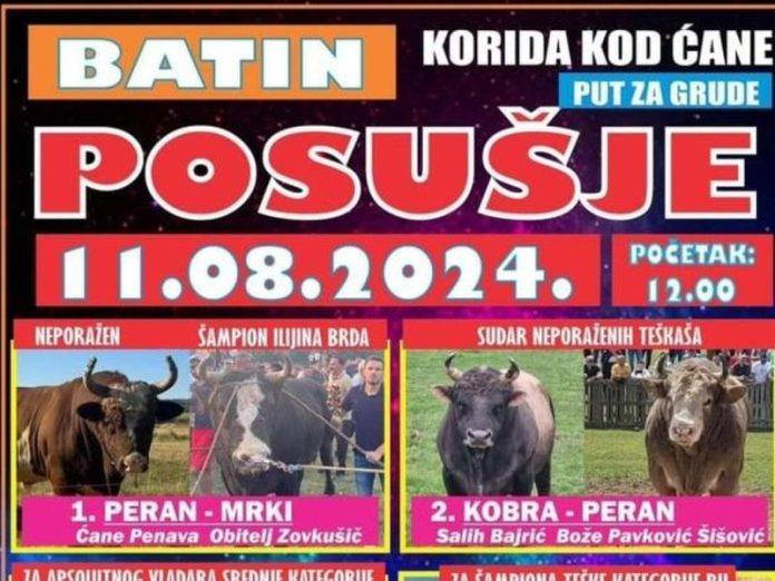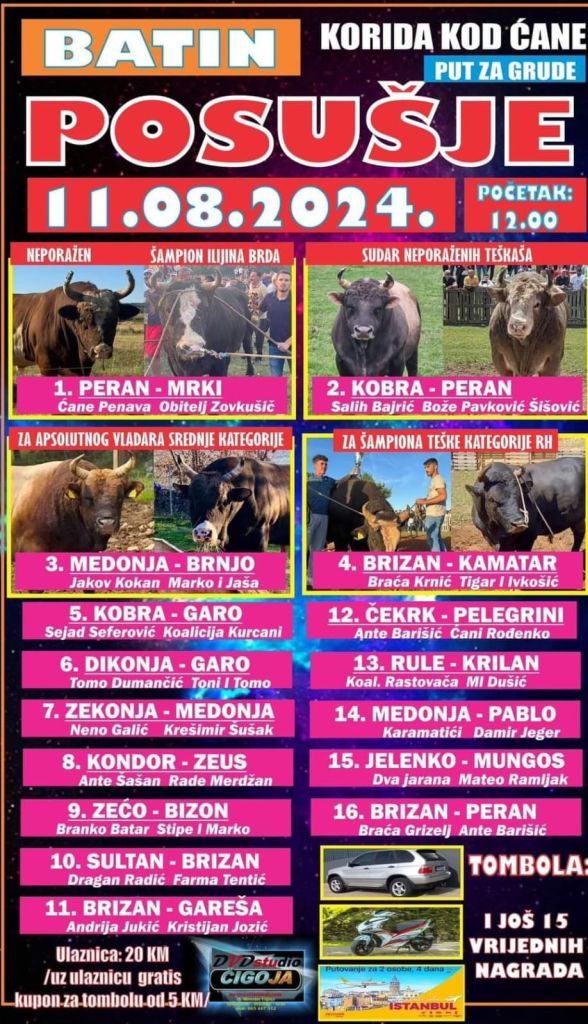 U Batinu kod Posušja (put za Grude) u nedjelju, 11. kolovoza 2024. godine organizira se spektakularna korida pod nazivom: “Korida kod Ćane”.