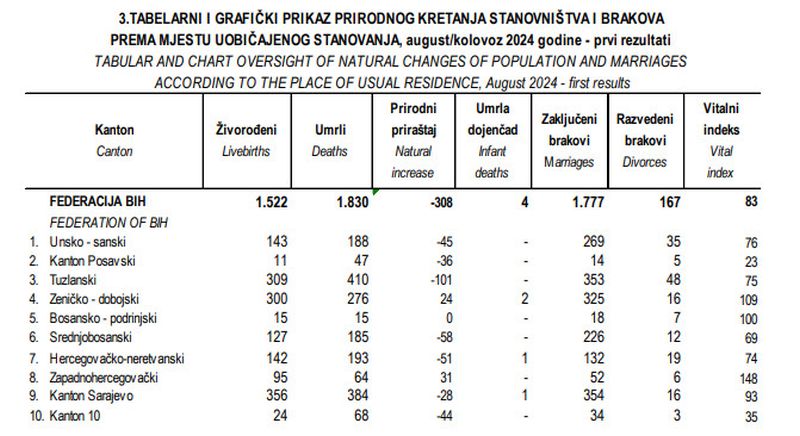 U Federaciji BiH u kolovozu prirodni priraštaj je negativan i iznosio je minus 308, a vitalni indeks, odnos broja živorođenih i umrlih osoba, je 83.