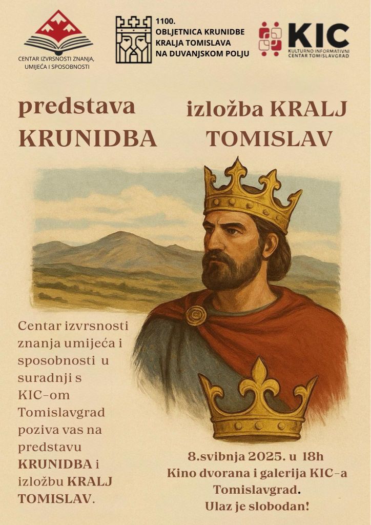 Prigodom 1100. obljetnice krunidbe kralja Tomislava na Duvanjskom polju, Centar izvrsnosti znanja, umijeća i sposobnosti i Kulturno informativni centar Tomislavgrad organiziraju u četvrtak, 8. svibnja u 18 sati predstavu “Krunidba” i izložbu “Kralj Tomislav“.