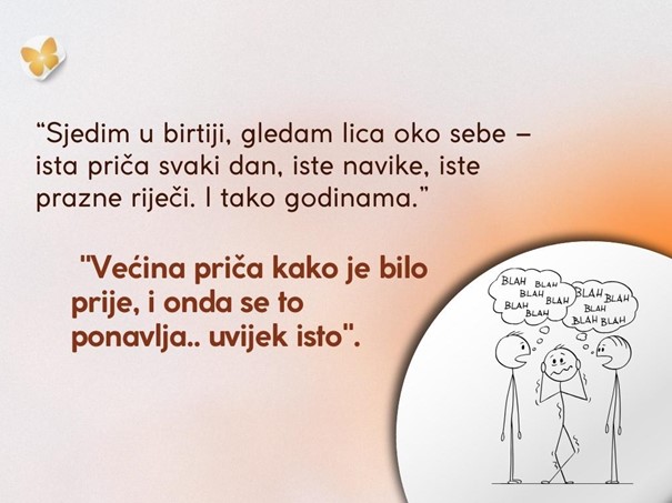 Ako osjećate da vas ova rutina guši ili ograničava, imajte hrabrosti napraviti prvi korak prema nečemu drugačijem. Umjesto da trošite sate u birtiji, pokušajte ih ispuniti nečim korisnijim – hobijem, učenjem, ili čak razgovorom sa stručnjakom koji može pomoći. Promjena nije laka, ali je moguća i uvijek vrijedi pokušati. Važno je ne odustajati od sebe.