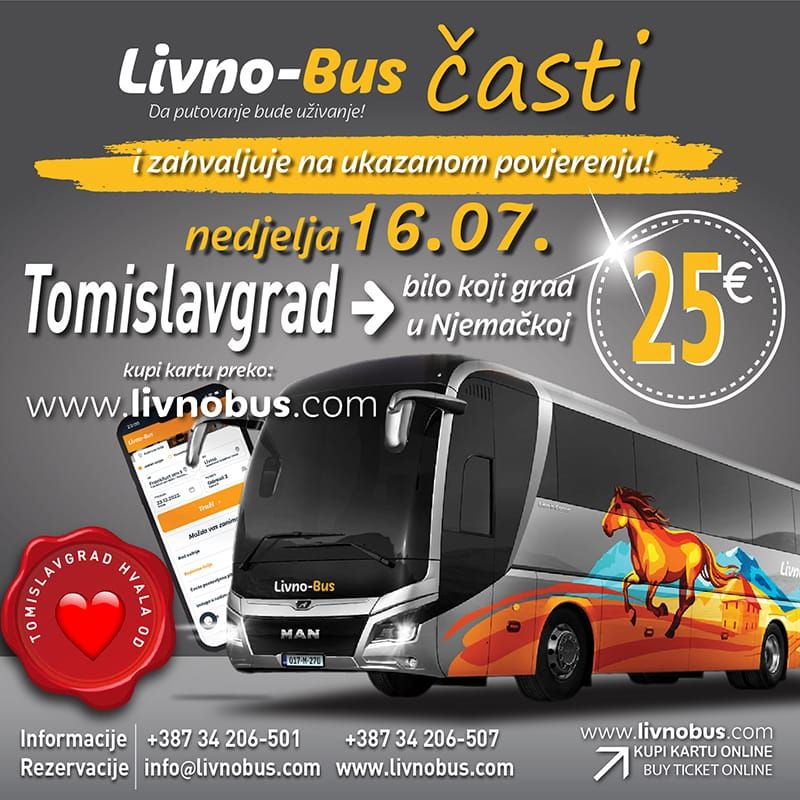 U nedjelju, 16. 7. Livno-Bus časti svoje putnike nevjerojatnom cijenom karte na međunarodnoj liniji iz Tomislavgrada prema bilo kojem gradu u Njemačkoj.
