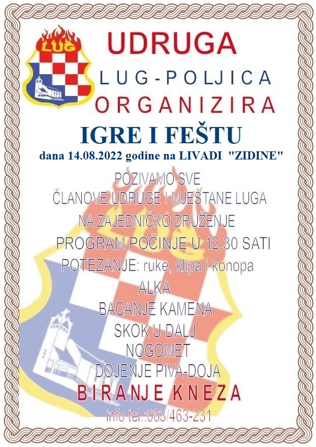 Udruga Lug – Poljica u nedjelju, 14.8.2022. godine na Zidinama – livadi ispod sela, organizira tradicionalnu “Lušku feštu“. Pozivaju sve Lužane, luške zetove i sve prijatelje Luga i Lužana da nazoče ovoj, po mnogo čemu, posebnoj fešti.