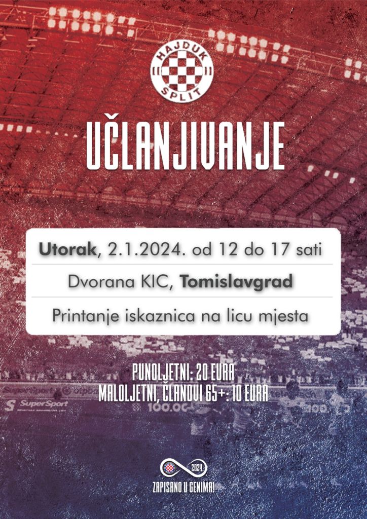 Pozivaju se svi članovi, prijatelji i simpatizeri HNK Hajduka na tradicionalno učlanjivanje koje će biti organizirano u utorak, 2. siječnja 2024. godine u vremenu od 12 do 17 sati kod dvorane KIC-a u Tomislavgradu.