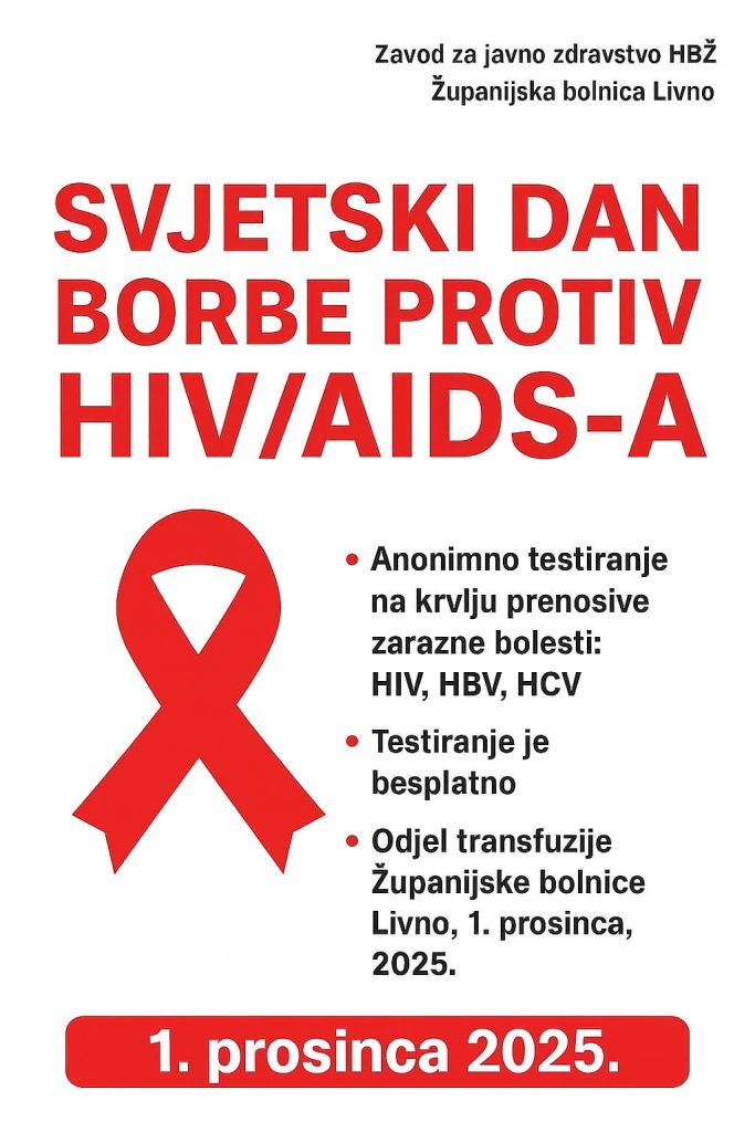 U Županijskoj bolnici dr. fra. Mihovil Sučić Livno taj dan, u organizaciji Zavoda za javno zdravstvo HBŽ i Županijske bolnice, bit će organizirana anonimna testiranja na krvlju prenosive zarazne bolesti – HIV, hepatitis B i C.