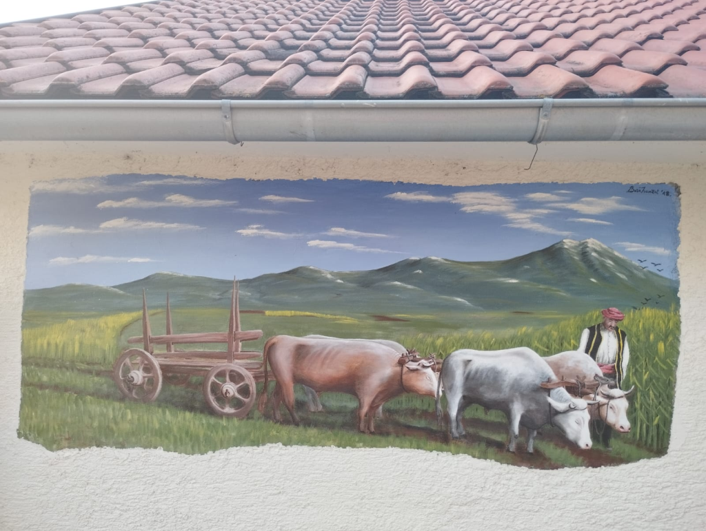 Još jedan mural, vrijedan spomena, Bože je naslikao prije nekoliko godina na obiteljskoj kući u Dobrićima. Ovaj je mural naslikan uljanim bojama i prikazuje radove u nekadašnjem polju – Buškom Blatu (današnje Buško jezero). Žito, koje se kosilo i pripremalo za vršenje, prevozilo se zaprežnim kolima.