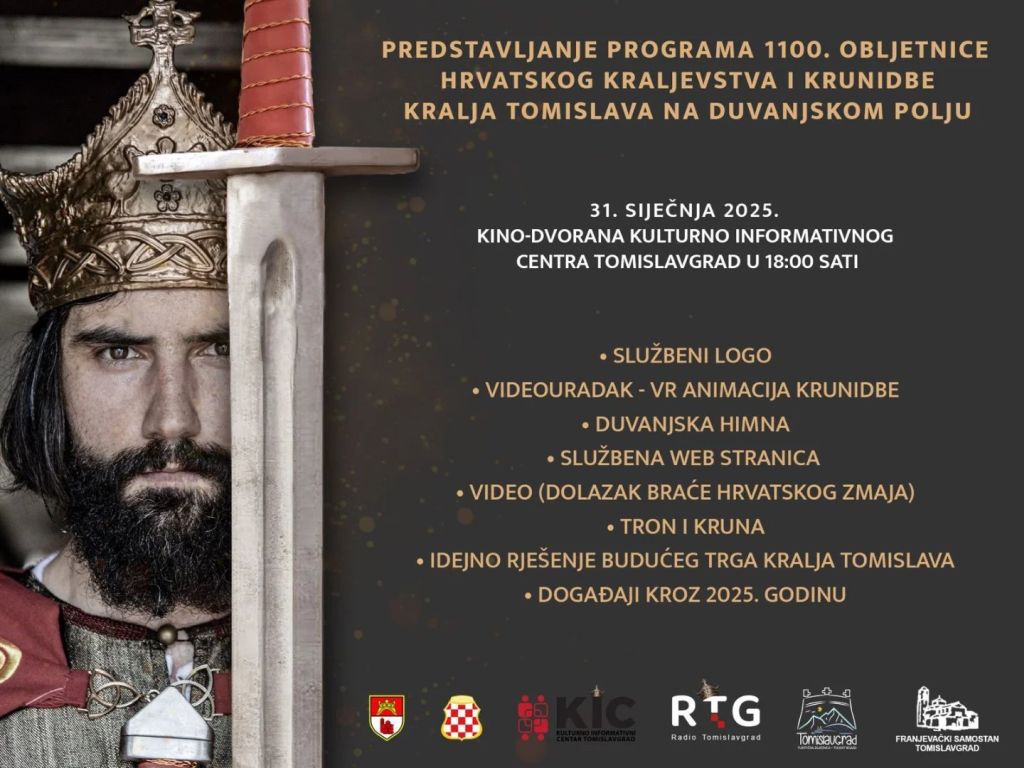 Organizacijski odbor 1100. obljetnice Hrvatskog Kraljevstva i krunidbe kralja Tomislava na Duvanjskom polju s ponosom poziva sve ljubitelje povijesti, kulture i tradicije na predstavljanje Programa obilježavanja ovog povijesnog jubileja u Tomislavgradu.