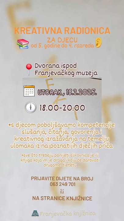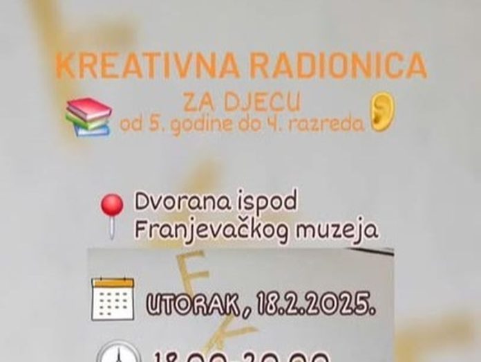 Franjevačka knjižnica Tomislavgrad organizira kreativnu radionicu za mališane od 5 godina, a održat će se u utorak, 18. veljače, od 18 do 20 sati u dvorani ispod Franjevačkog muzeja. Na radionici mogu sudjelovati i učenici do 4. razreda osnovne škole.