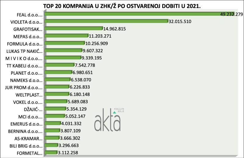 Prvo mjesto po ostvarenoj dobiti zauzeo je FEAL s 49.232.279 KM, dobit Violete je 32.015.510 KM, a na trećem mjestu je GRAFOTISAK s 14.962.815 KM.