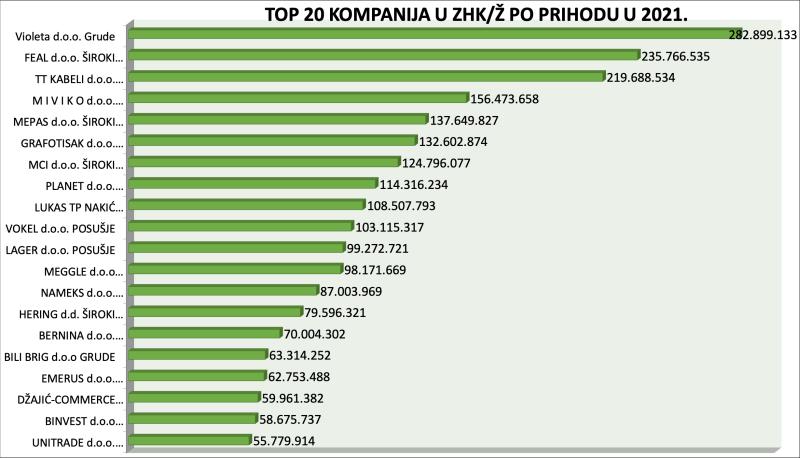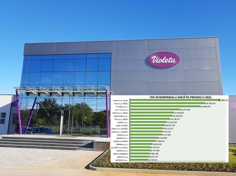 Kao i prethodnih godina Violeta je lider po prihodu u ŽZH s 282.899.133 KM, a slijede je FEAL s 235.766.535 KM i TT KABELI s 219.688.534 KM.