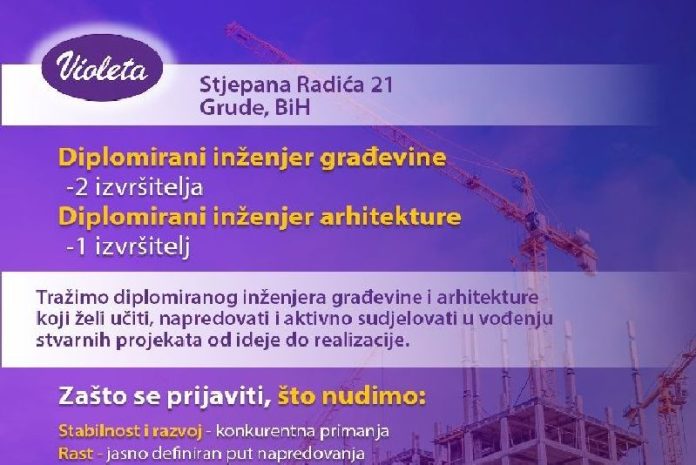 Naslovnica Obavijesti/ Najave Violeta zapošljava diplomirane inženjere građevine i arhitekture Obavijesti/ NajaveOglasi Violeta zapošljava diplomirane inženjere građevine i arhitekture Objavio TC - 5. ožujka 2026. Link za prijavu je: https://violeta-doo.talentlyft.com/o/chrk/apply VEZANI ČLANCIVIŠE OD AUTORA SPORT VISION – natječaj za prijem radnika u Tomislavgradu Eco selo Grabovica nudi besplatan fizioterapeutski pregled Eko Stridon iznajmljuje poslovne prostore u Tomislavgradu Imena svih poginulih hrvatskih branitelja bit će uklesana na spomen obilježju... 22. travnja 2026. ŠGD „Hercegbosanske šume“ d.o.o. Kupres: dva nova kamiona šticara za isporuku... 22. travnja 2026. Nastavljen blagi pad cijena dizela u FBiH 22. travnja 2026. Doc. dr. sc. Mišo Jurčević iz Vinice dobitnik Državne nagrade za... 22. travnja 2026. Dan planeta Zemlje (foto/video) 22. travnja 2026.