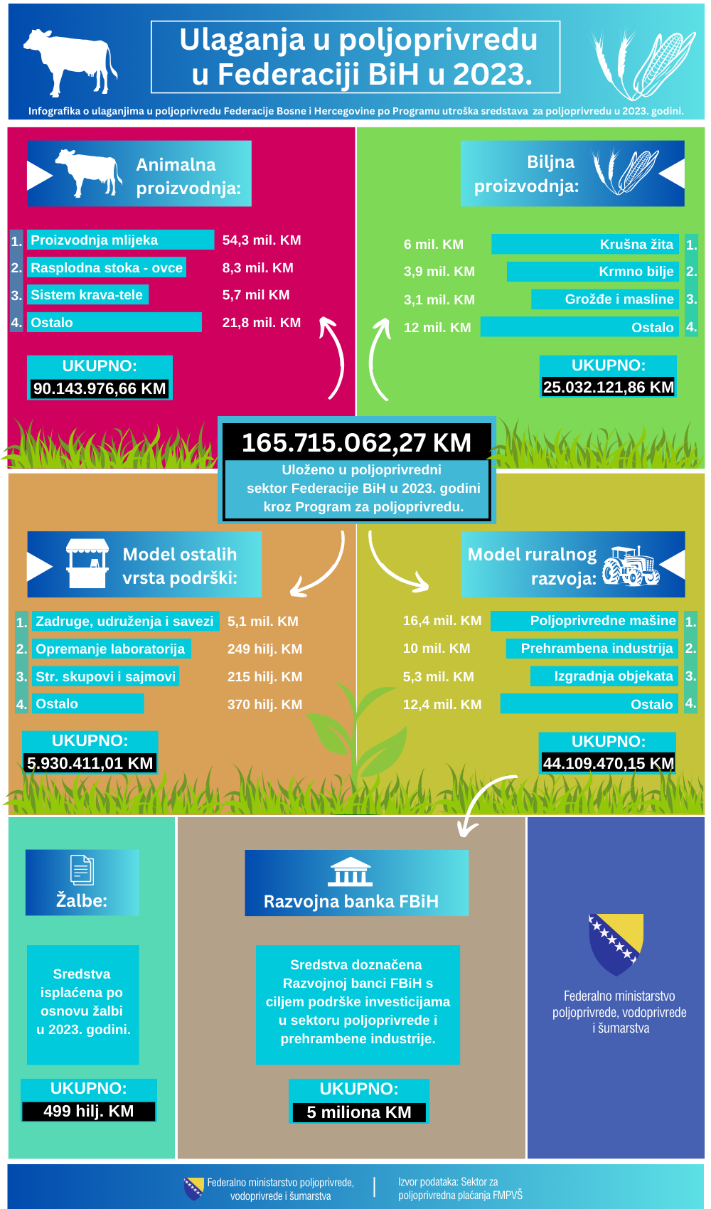 Za proizvodnju su isplaćene novčane podrške u iznosu nešto većem od 115 milijuna KM, u koje je uvršten i posljednji kvartal 2022. godine. Od toga je za animalnu proizvodnju isplaćeno 90,1 milijun KM, a za biljnu 25 milijuna KM.